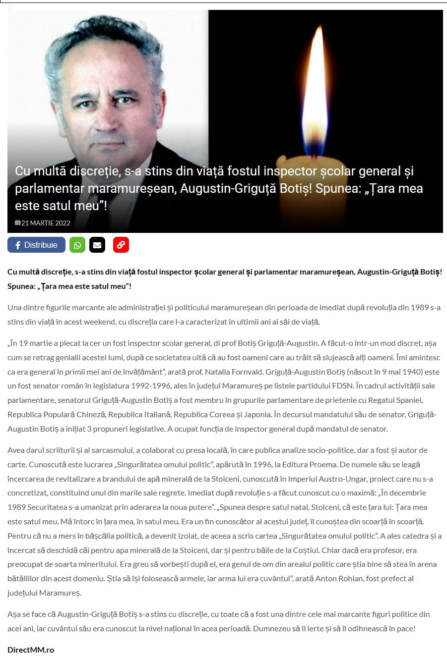 Drag Domnule profesor Botiș, ai plecat dintre noi, nerecunoscătorii unui Maramureș care ți-a fost sat și țară, înainte să te fi putut căuta, să te mai văd și să te mai aud încă o dată, să-ți mulțumesc pentru a-mi fi dat ceea ce nici boala și nici durerea nu-mi pot lua, iubirea îndrăgostirii de poezia adâncă, întunecată și greu de văzut, ca ascuțișul topoarelor și dălților care au cioplit porțile de nemurire de dinaintea caselor moroșenești, unde opincile, clopul, cetera și zongora au rămas mărturii ale unui neam cu spinări de brad și suflet de șipot.